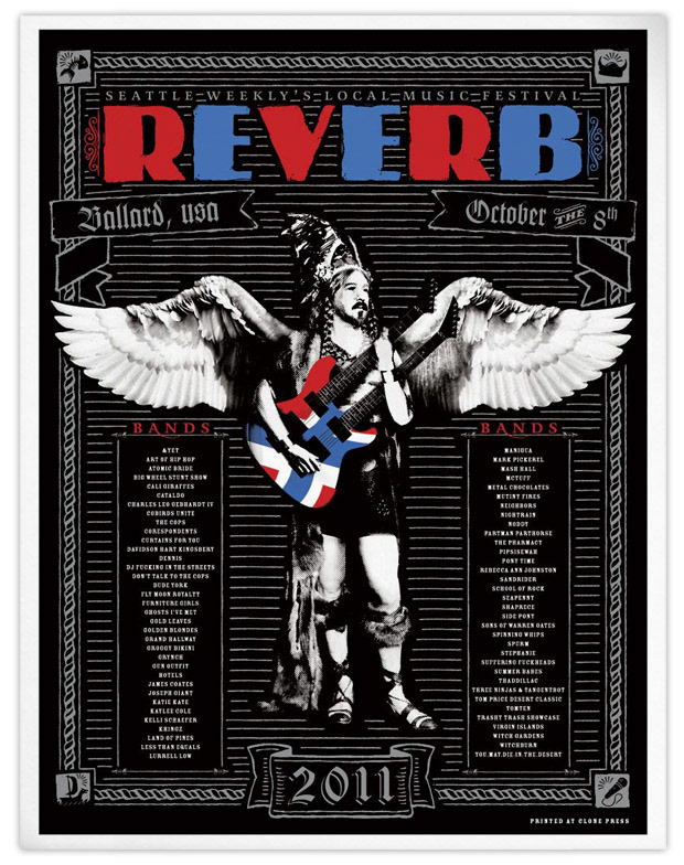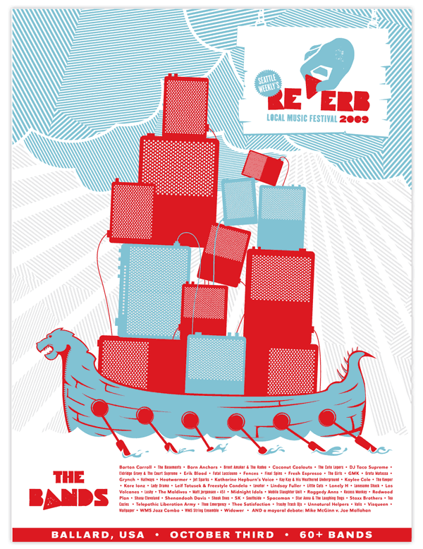 For three years I made collateral and marketing materials for Seattle Weekly's Reverb Music Festival. For the posters, I tied each to the festival's location: Ballard, Washington.